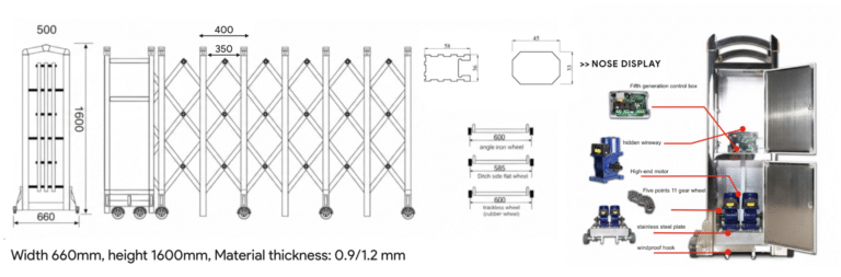 1.Retractable gate are also called collapsible gates, they are mainly used where large openings are need. 2.It is made of stainless steel or aluminum.